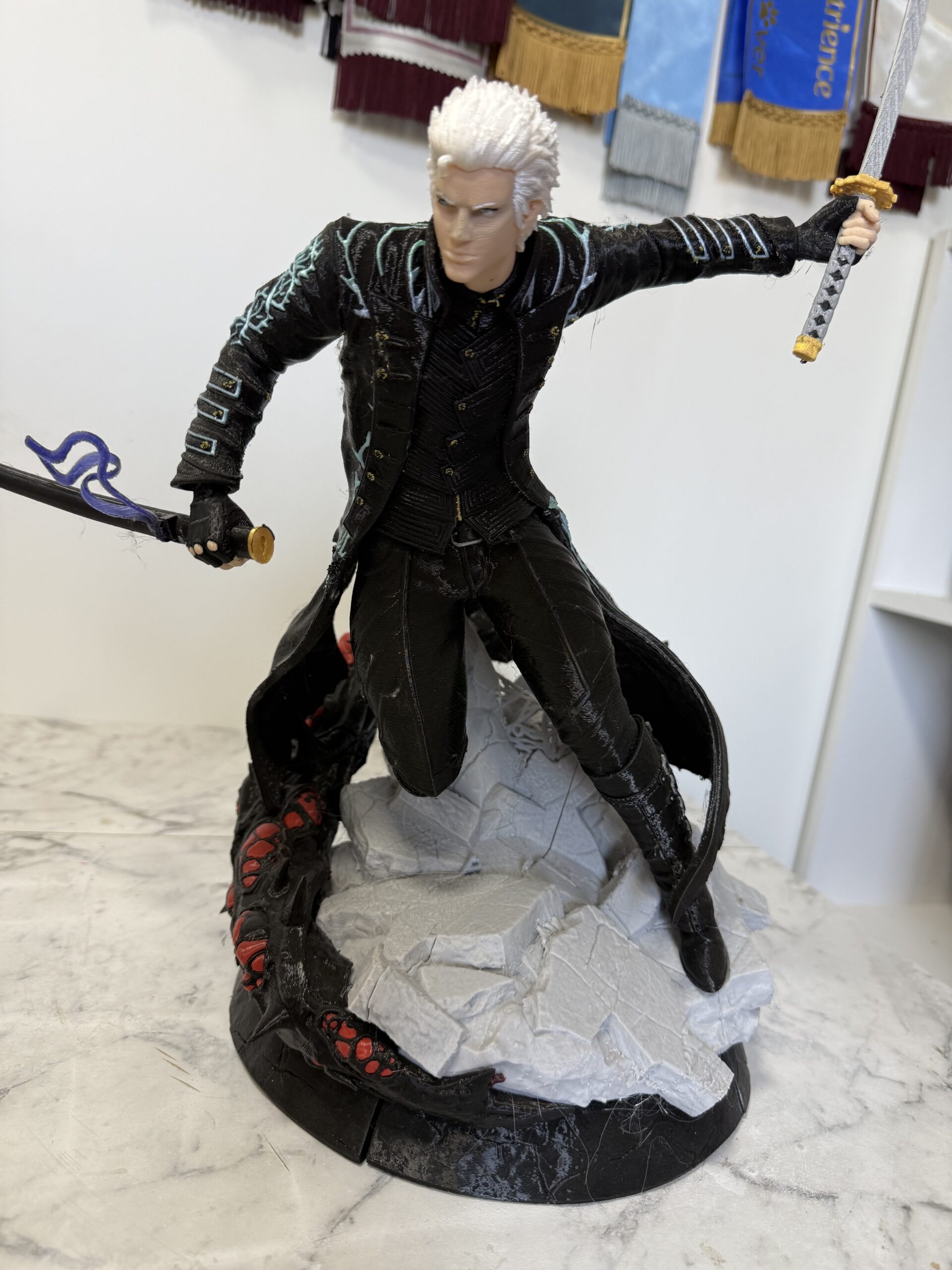 This one-of-a-kind Vergil figure captures the cold precision and unrelenting focus of Dante’s infamous twin from Devil May Cry. Fully 3D printed, he’s posed mid-combat with Yamato drawn, coat flowing, and surrounded by demonic tendrils that ripple with menace.